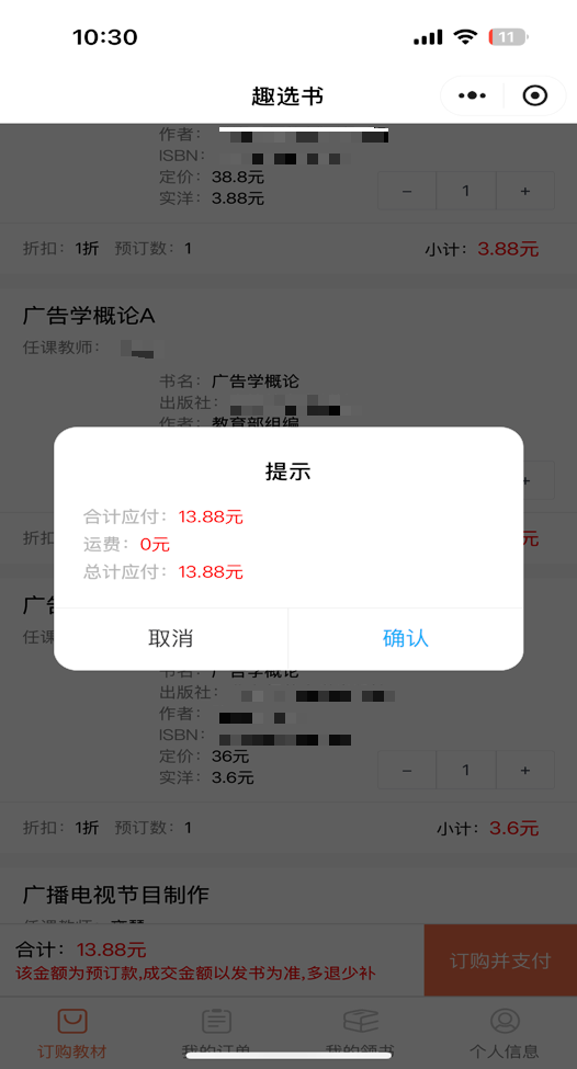 登录“趣选书”小程序后,“订购教材”板块会显示个人正选课后课表对应的教材(教辅)信息,以及教材(教辅)的预估价格。请根据个人实际需求,若不需要订购,请点击“-”号,把教材数量修改为“0”(见图1所示)。选定后,点击“提交订单”,并进行支付。支付过程中,若存在欠往期教材费的情况,本次需一并支付;若账户有余额的情况,可采用余额 微信合并支付的方式,进行支付(例:账户余额20元,本期购书30元,本期需支付10元),支付成功则确认为有效订单(见图2、3、4所示),开学时按班级为单位进行教材领取,若未支付,则视为无效订单。