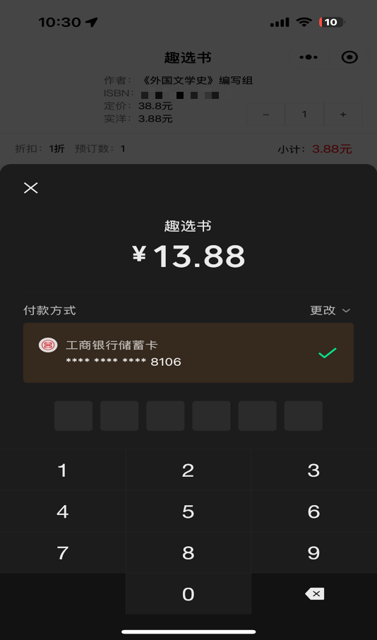 登录“趣选书”小程序后,“订购教材”板块会显示个人正选课后课表对应的教材(教辅)信息,以及教材(教辅)的预估价格。请根据个人实际需求,若不需要订购,请点击“-”号,把教材数量修改为“0”(见图1所示)。选定后,点击“提交订单”,并进行支付。支付过程中,若存在欠往期教材费的情况,本次需一并支付;若账户有余额的情况,可采用余额 微信合并支付的方式,进行支付(例:账户余额20元,本期购书30元,本期需支付10元),支付成功则确认为有效订单(见图2、3、4所示),开学时按班级为单位进行教材领取,若未支付,则视为无效订单。